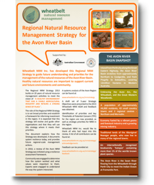 Wheatbelt NRM has developed this Regional NRM Strategy to guide future understanding and priorities for the management of the natural resources of the Avon River Basin.